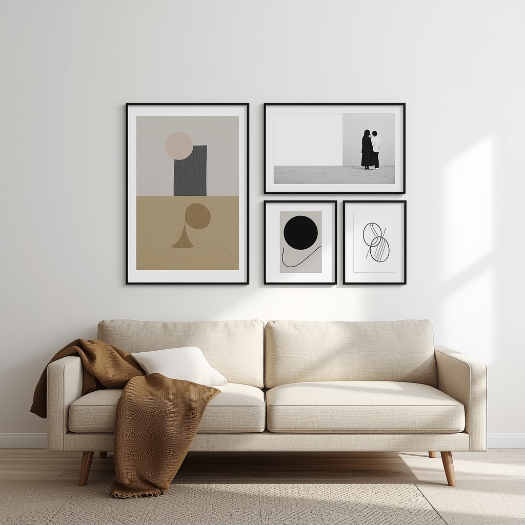 Use one large statement piece and surround it with two to four smaller prints. Keep the space between frames wide so the wall never feels crowded.